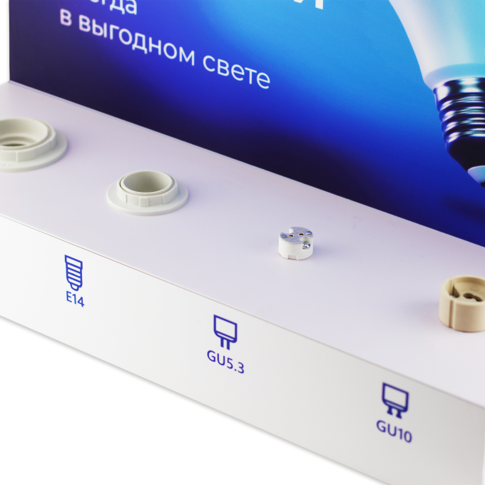 Стойка Триколор предназначена для демонстрации и проверки работоспособности ламп марки Триколор с цоколем E27, E14, GU5.3 и GU10.